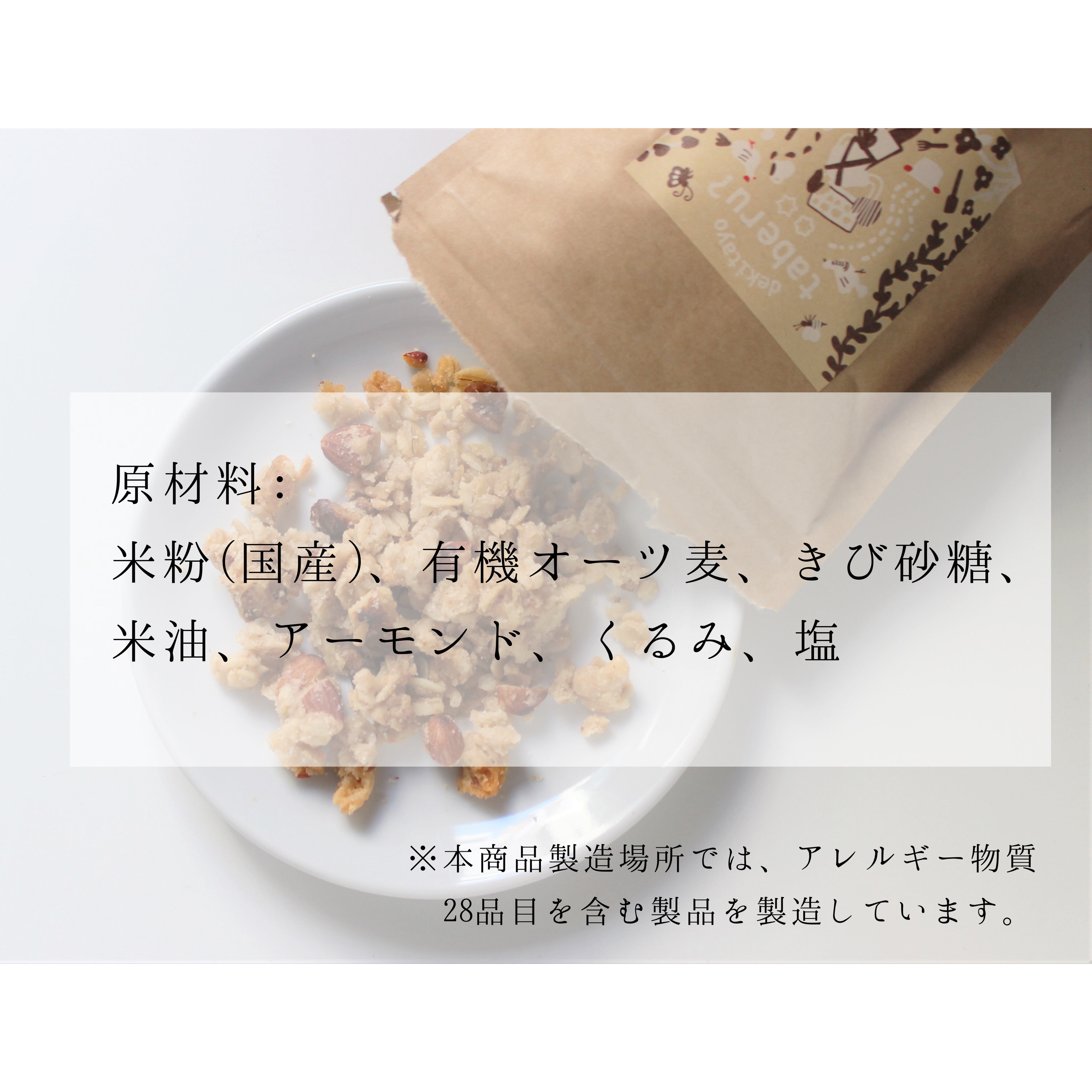 米粉(国内製造)、有機オーツ麦、きび砂糖、くるみ、アーモンド、米油、塩